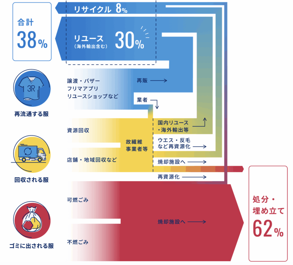 - 日本では、年間で家庭から手放される衣類のうち、リユース・リサイクルされる衣類は38%ほど。一方で約62%は、可燃ごみ・不燃ごみとして焼却または埋め立てられています。 環境省
