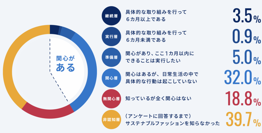 環境省の調査によると、多くの人がサステナブルファッションに興味を持っており、「関心層」「準備層」「実行層」など、関わり方に幅があります。