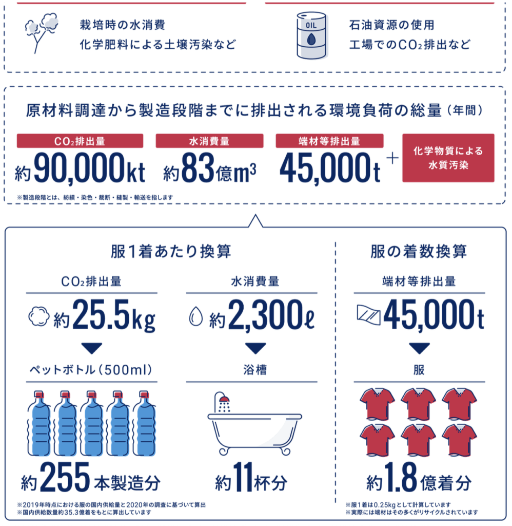 - 衣服の原材料(たとえばコットンなどの天然繊維)を育てるには大量の水が必要で、化学肥料を使うと土壌や水質汚染を引き起こすことがある。合成繊維(ポリエステル等)は石油資源を使い、製造時にCO₂を多く排出する。 環境省