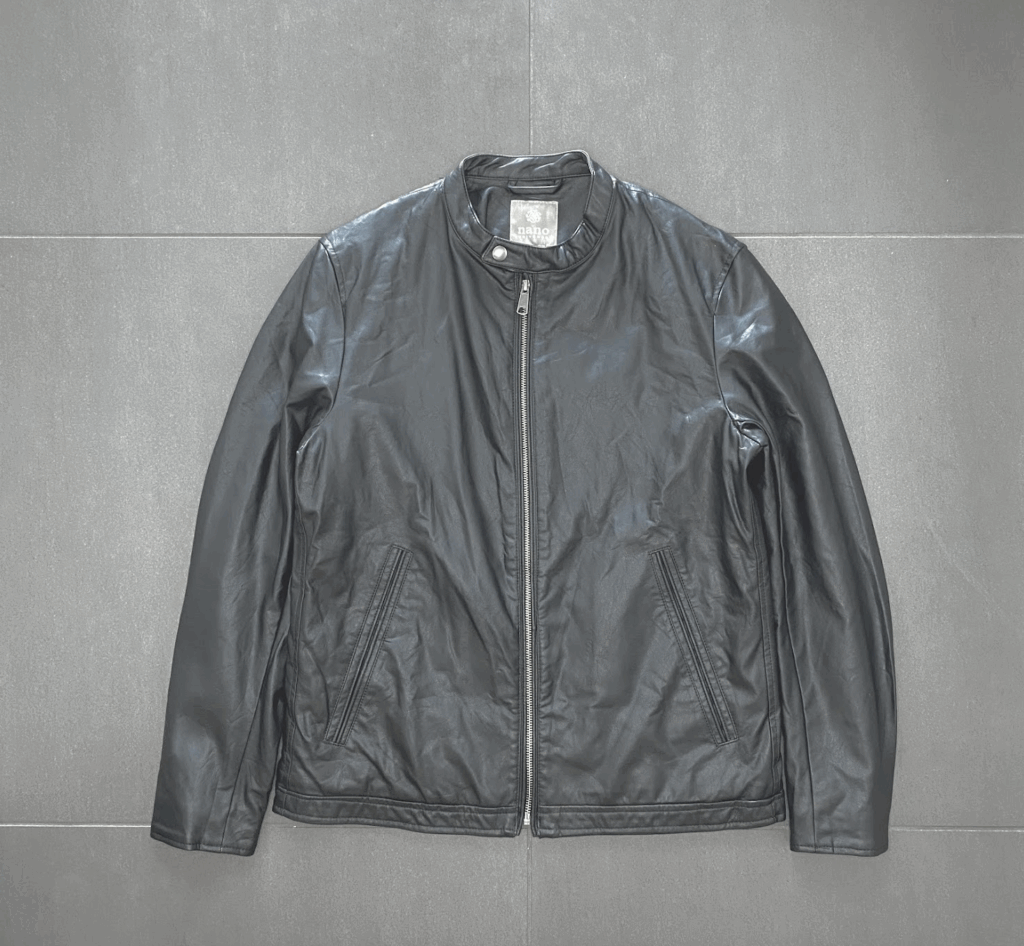 襟を取り除いたクラシックなレザージャケットは、きれいめスタイルに相性抜群。